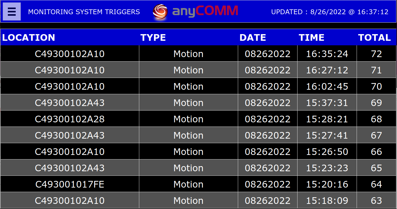 anyCOMM provides live monitoring of the data analytics from the nodes and peripherals. Certain events